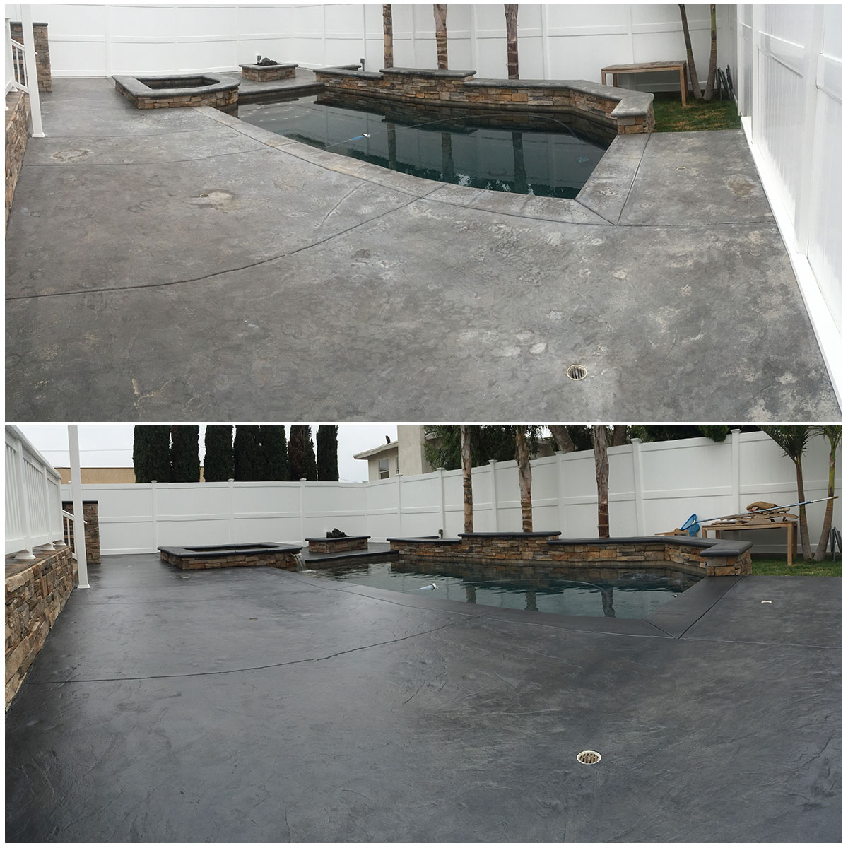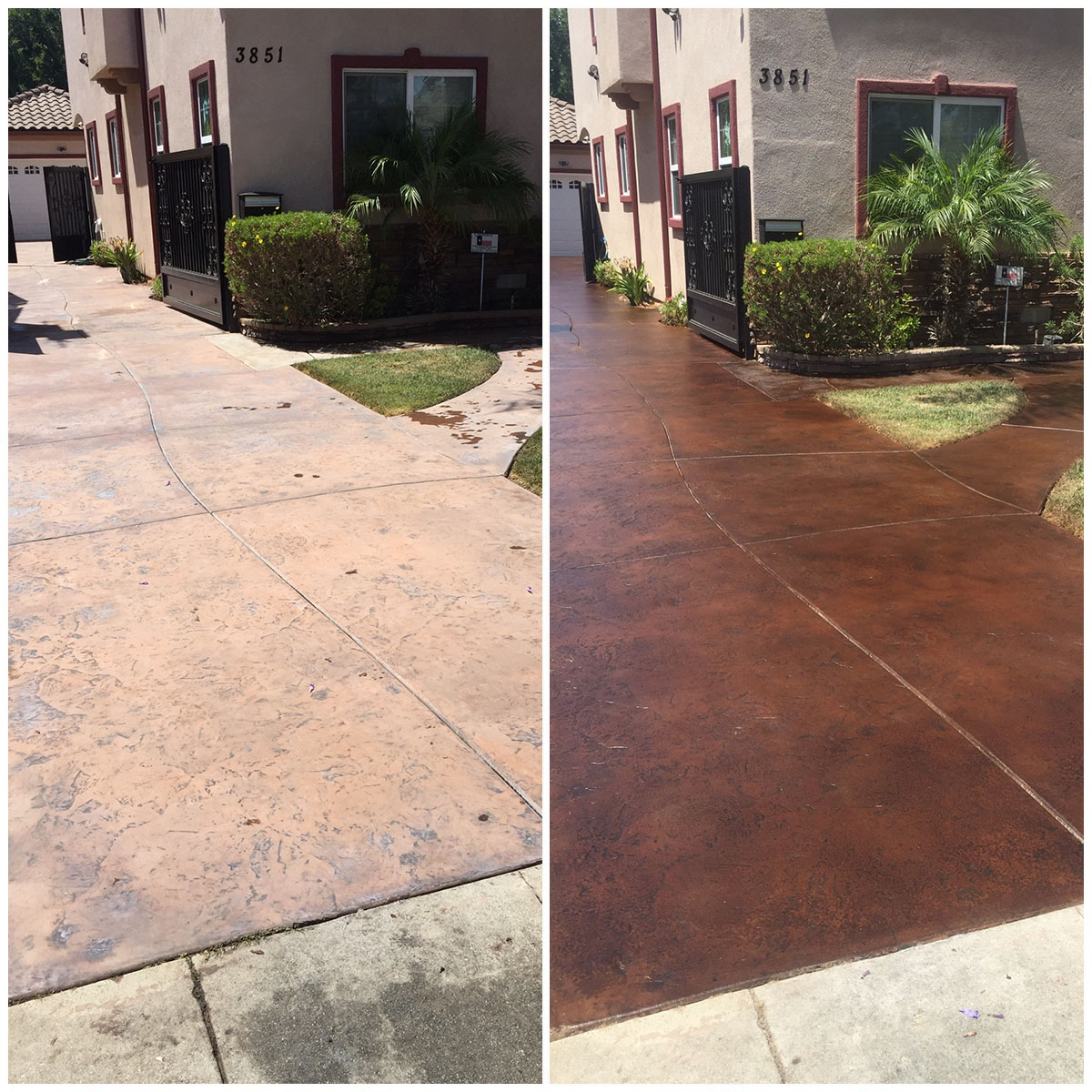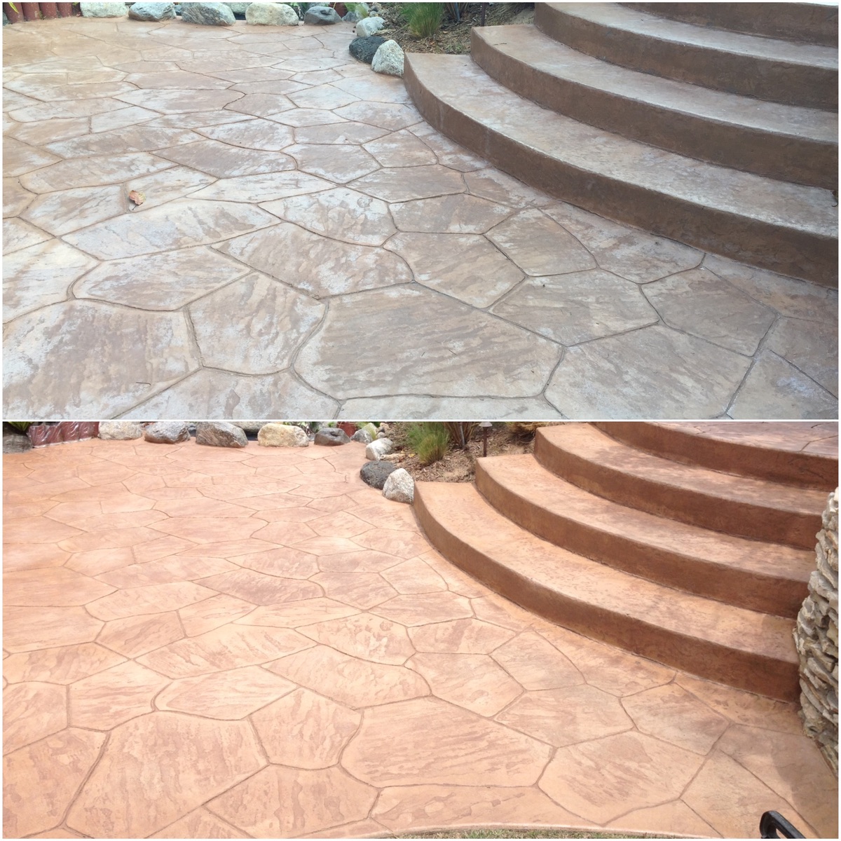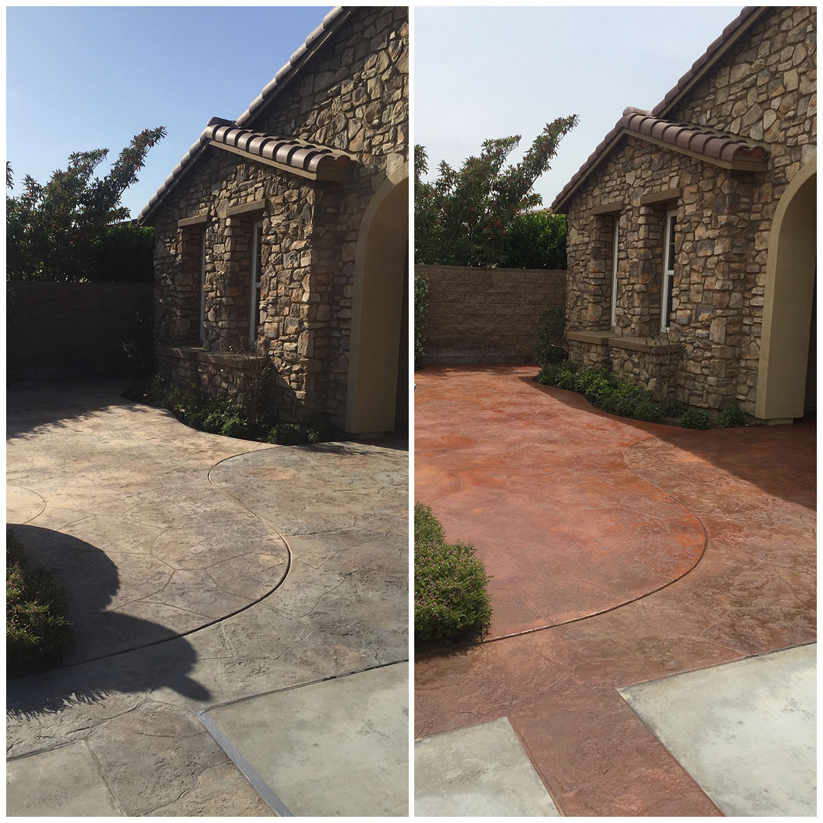 Our three-step concrete staining process ensures that the final results look great and last for years to come. Other companies may simply add a thin concrete texturing coating that looks good initially but essentially just sits on the surface and can easily flake, fade, or peel.